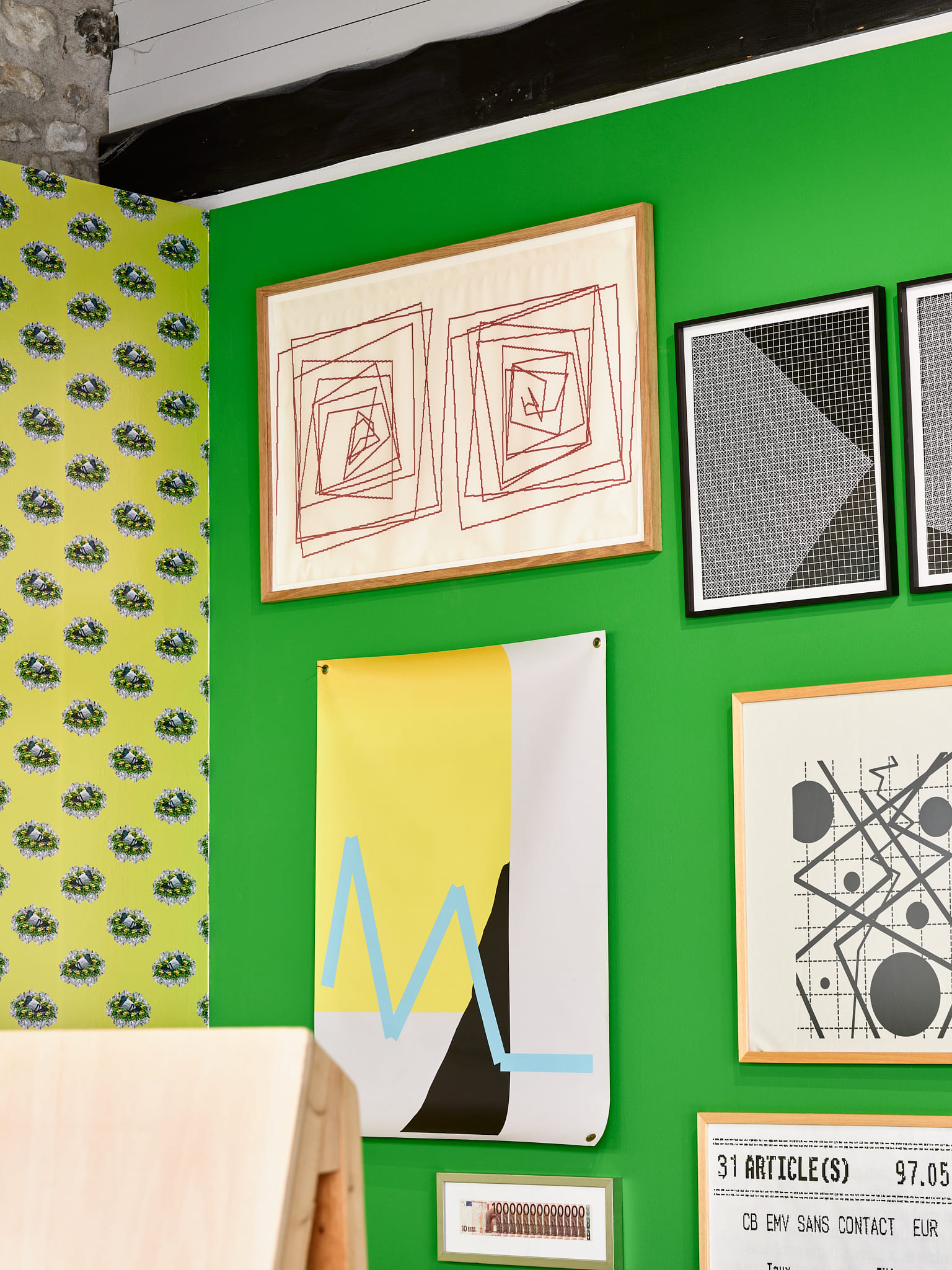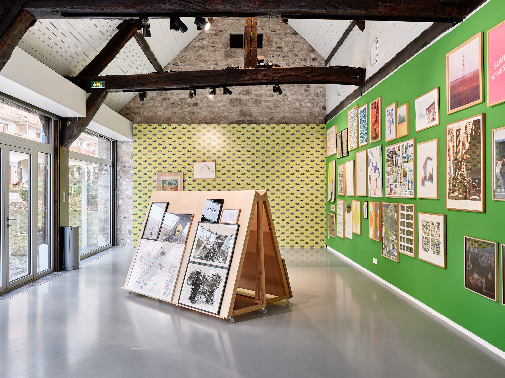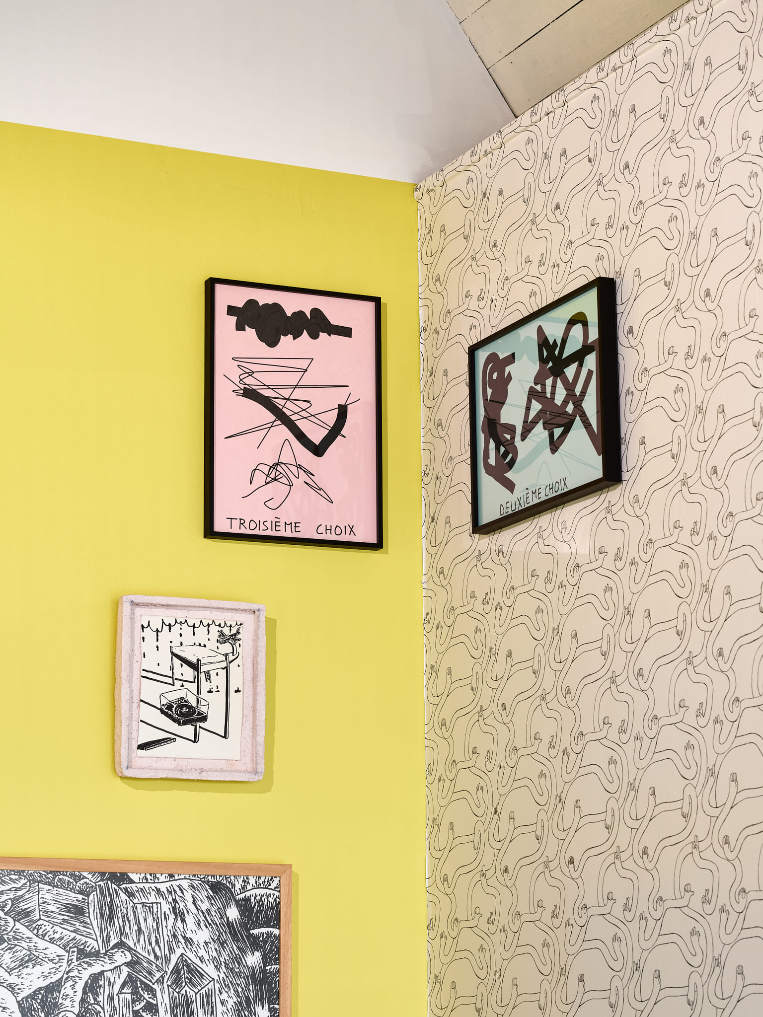 Afin de jouer d’une scénographie à la croisée d’un lieu d’exposition et de l’intérieur d’une habitation, explorant les possibles d’un accrochage sur les murs, Marie-Margaux Bonamy et Hélène Souillard ont été invitées à proposer individuellement une œuvre prenant la forme d’un papier peint pour un mur dans l’exposition sur lequel les deux jeunes artistes ont sélectionnées un choix d’œuvres en dialogue avec leur motif.